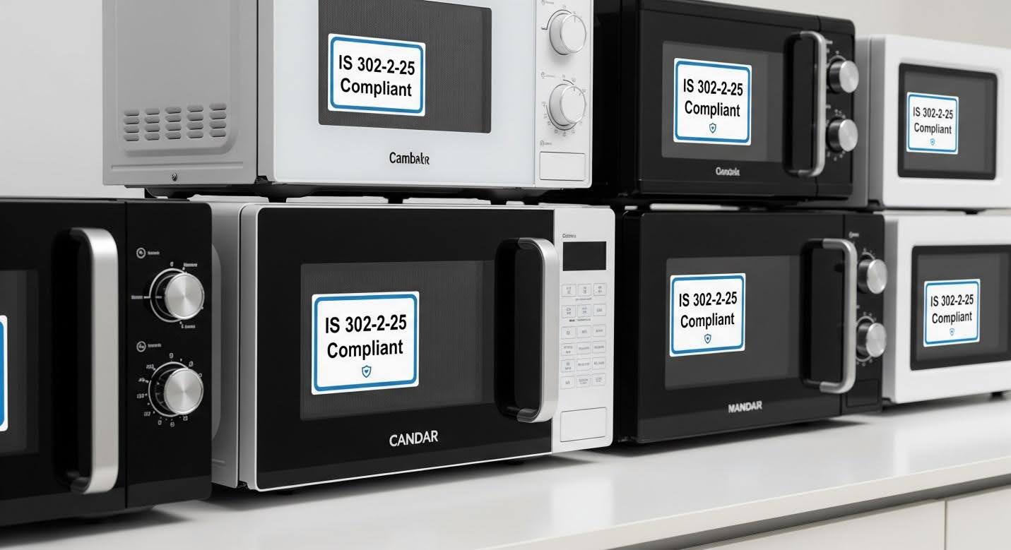 Microwave ovens must comply with IS 302-2-25 under CRS 2021. All stakeholders must ensure BIS registration, marking, and testing before sale, import, or distribution in India.